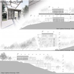 Proje alanı arazinin doğal verileri ile şekillenmiş olup binanın alanı ve arazinin eğimi göz önüne alınarak teraslanma ile birimler oluşturulmuştur. Binanın teraslanma yönü görüntü ve gürültü kirliliğini absorbe ederek birimlerin geniş bir vistaya sahip olan yarı özel avlular oluşturulmasına imkan sağlamıştır. Arazinin batı cephesine birimler arası ulaşımı yatay ve dikey akslarda sağlayan açık dolaşım aksı yerleştirilmiştir. Bu aks engellilerin kullanabileceği asansörü ve arazinin eğime dik bir şekilde uzanan vistasını görebilen merdiveni içermektedir. Bu dolaşım aksı sıra ile cemevinin bulunduğu +165.00 kotundan başlayıp, insanları işlevsel olarak genelden özele doğru bir kullanıma sahip olan birimlere ulaştırmaktadır.